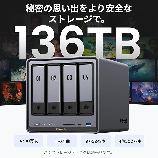 大容量ストレージ:容量不足の心配を解消します。最大136TBの容量で、3,900万枚の写真や76,000本の動画を保存できます!
