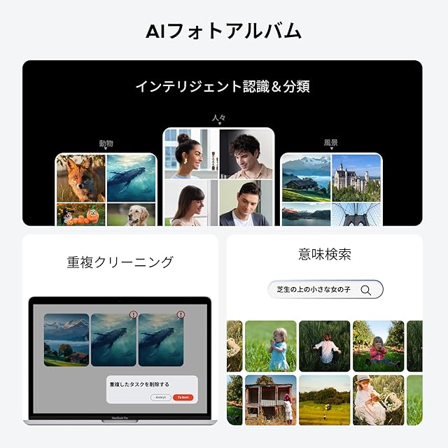 AI搭載フォトアルバム:顔、シーン、オブジェクト、場所を認識し、写真を自動的に整理します。また、重複した写真を瞬時に削除することで、貴重なストレージ空間や管理時間を大幅に節約します。
