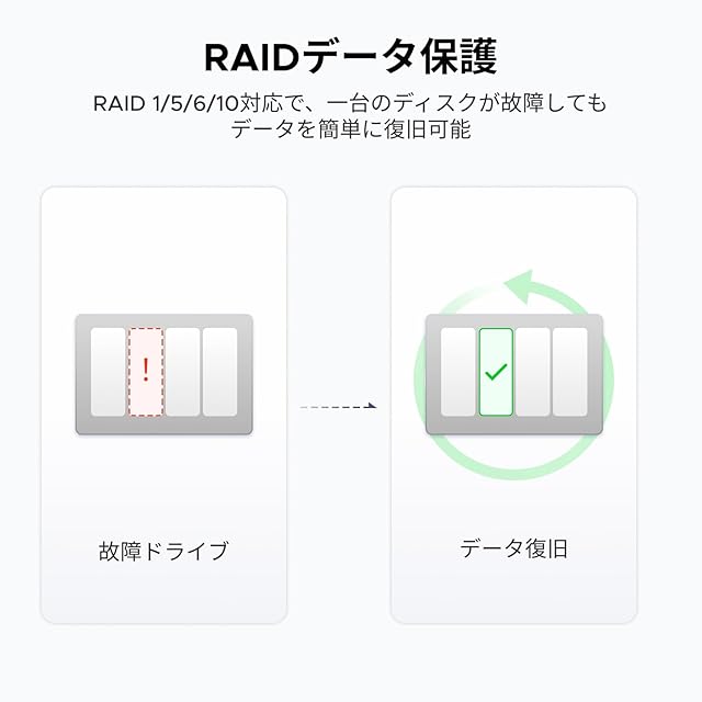 外付けドライブを超える高性能保存ツール:NASは、集中型ストレージ、自動バックアップ、リモートアクセス、多様なRAIDパターンを提供し、ドライブが故障した場合でも簡単にデータを復旧できます。
