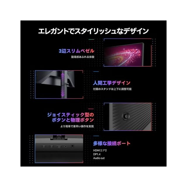 【豊かな接続性&人間工学デザイン】DP(1.4)*1、HDMI(2.1)*2、3.5mmオーディオ*1、様々な端子に対応。スクリーンは縦横の回転、高さの調整、ピッチの角度微調整、左右の角度微調整、壁掛け(VESA規格75*75mm)が可能で、スタンドに付きるホルダーはケーブルの整理やデスクトップの整頓に利用できます。