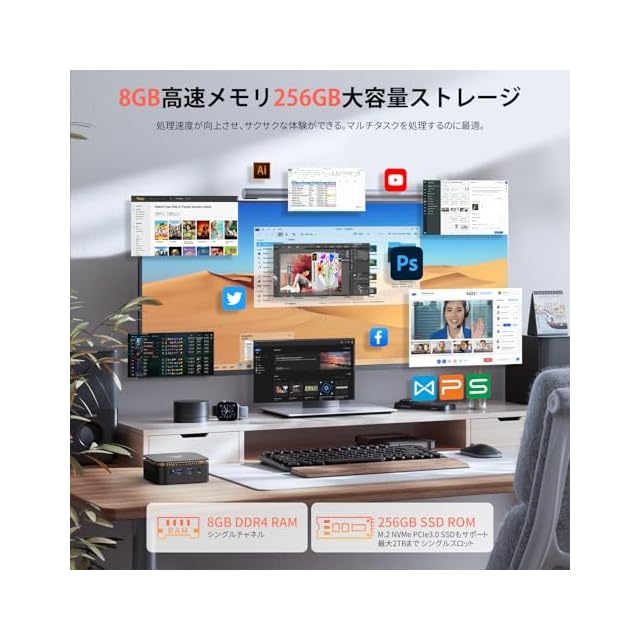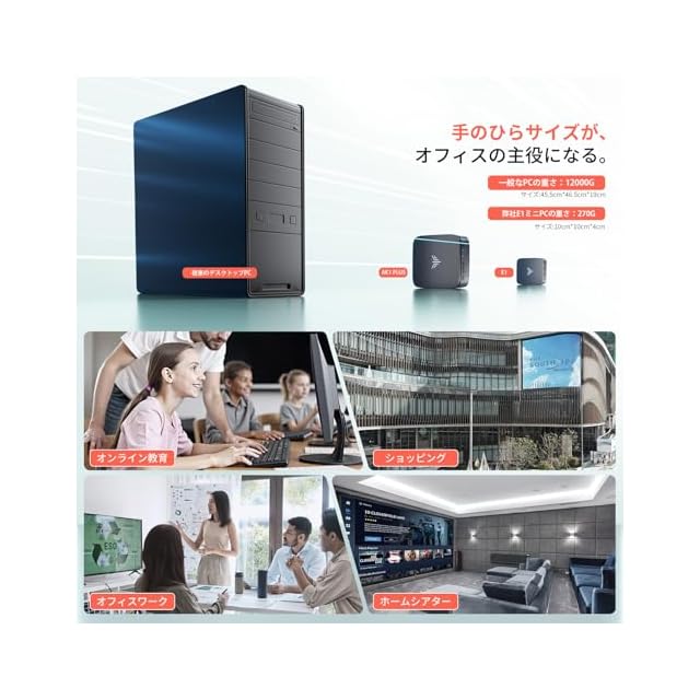 2.【2025新型ミニPC→さらに小さくて軽い、さらにパワフルで静か】:小型pcはメモリ/ストレージが16GB+512GBを標準搭載しています。SSDの接続端子はM.2 NVMe PCle3.0 SSD/SATA SSD対応し、最大2TBまで換装可能です。DDR4高週波メモリは、システム全体の応答性を高め、非常に速く、ラグやジャンプがありません。2025新型省スペースミニPCとして、他社製品に比べて、体積60%削減(驚きの10×10×4cmに小型化進化)、超軽量274g(他社製品より30%軽量化)を実現しながら、処理性能は15%向上。●超静音冷却ファンを内蔵し、放熱が速く、騒音が少ないなどの特徴を持っています。高回転扇葉は熱を早く発散させ、熱による引き起こされるフリーズ、シャットダウン、ブルースクリーンなどの問題が前世代より大幅に削減し、PCの安定した動作をします。