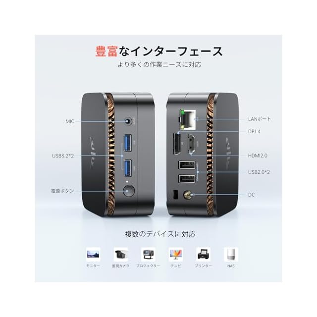 3.【豊富なインターフェース・臨場感あふれる4K Ultra HDグラフィックス】mini pcは、USB3.2 Gen2 (最大伝送速度10Gbps)*2 / USB2.0(Type-A)*2/ HDMI 2.0*1 /DP1.4*1/ギガビットLAN(RJ45)ポート*1 / 3.5mmイヤホンジャック*1 など豊富なインターフェイスを装備して、さまざまな周辺機器に対応します。 小型pcはHDMI 2.0×1 + DisplayPort 1.4×1 で 2画面同時4K@60Hz表示により、ビジネス/オンライン教育/在宅ワーク/動画編集/株取引/リモート会議などのマルチウィンドウ作業効率化になります。N97ミニpcは最新な改良されたリソグラフィーIntel 7で構築されたUHDグラフィックスGPUを採用してパソコンの操作、画像と音声の処理能力をより安定性がアップ!HDMI+DPでの4096 x 2160高解像度に対応できのmini pc、フルハイビジョンの4倍の解像度で、よりいつそう美しい映像が楽しみます。
