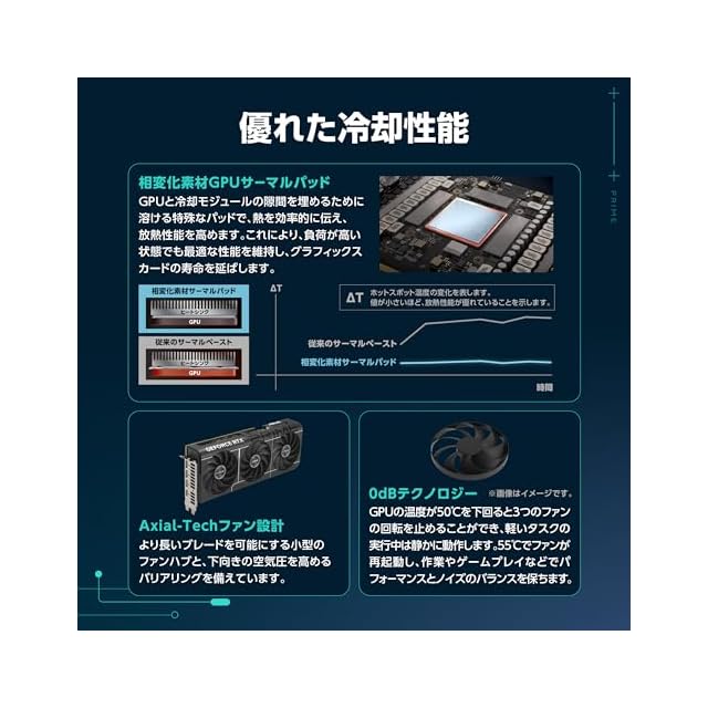 0dBテクノロジー:GPU温度が50°C未満でファン停止、55°C以上で再起動し、性能と静音を両立。