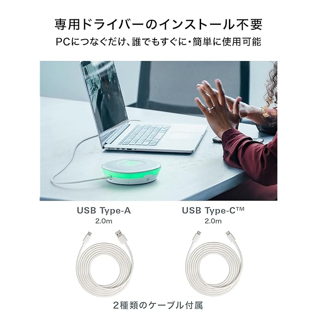 PC につなぐだけ、誰でもすぐに・簡単に:USB Type-AとUSB Type-Cに対応。ドライバー不要でお持ちの機器とUSB接続するだけで、すぐに通話できるプラグ&プレイに対応するほか、Windows / Mac両⽅で使⽤することができます。