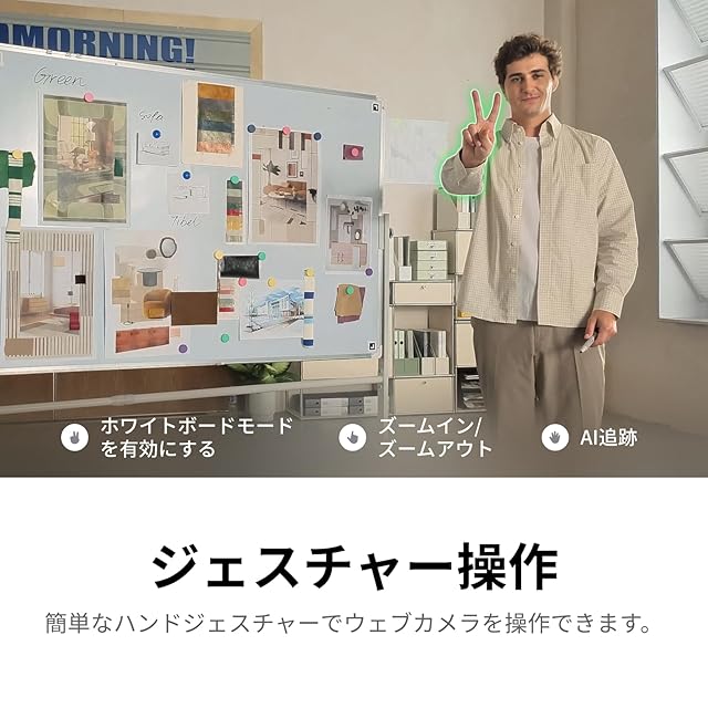 スマート操作: シンプルなジェスチャーまたはスマートフォンでウェブカメラを管理して、非常に便利に使用できます。3 つの簡単なジェスチャで制御します。AI トラッキングの有効化、ズームイン/ズームアウト、ホワイトボード モードの有効化です。