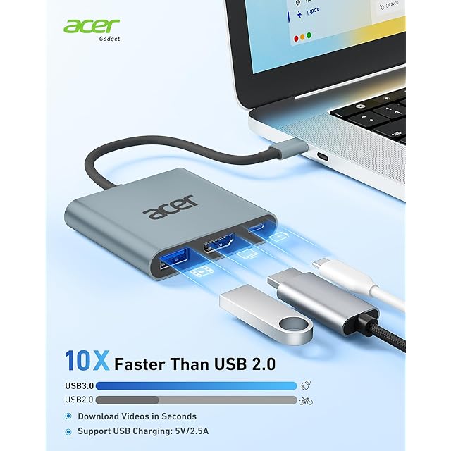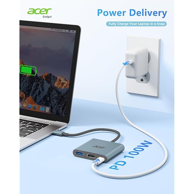 【多機能3-in-1 USB-Cハブ】Acer USB-Cハブでラップトップの接続性をアップグレードしましょう。HDMI 4K@30Hz出力ポート、PD充電ポート(充電機能のみ)、USB-A 3.0ポートを搭載しています。iPhoneやiPadの画面をテレビ、プロジェクター、モニターに簡単にミラーリングできます。ホームシアター体験の強化、オフィスの生産性向上、旅行時の利便性向上などに最適です。