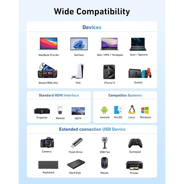 【優れた互換性】高品質のアルミニウム製ハウジングを採用し、耐久性と放熱性を向上させています。このUSB-C to HDMIアダプターは、ラップトップ、タブレット、スマートフォンなど幅広いデバイスとの互換性を持っています。MacBook Pro/Air、iPad Pro/Air、HP、Acer、Dell XPS、ラップトップ、Surface、タブレット、Steamなどで使用するように設計されており、Windows、ChromeOS、Linux、macOS X 10.5以上など複数のオペレーティングシステムでシームレスに機能します。注:iPhone、iPad、iPad Pro(Lightningポート)、ポータブルモニター、Galaxy A/ Tab Aシリーズ、GoProシリーズ、Motorolaフォン、Fireタブレットとは互換性がありません。