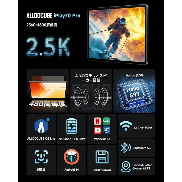 ALLDOCUBE iPlay70 Pro タブレット 11インチ 2560×1600解像度 顔認識 4つスピーカー 8コアCPU Helio G99 タブレット WidevineL1 Netflix対応 18GB+256GB+1TB拡張 7000mAh 18W PD急速充電 Android 14 ALLDOCUBE OS Lite 4G LTE GPS 重力センサ