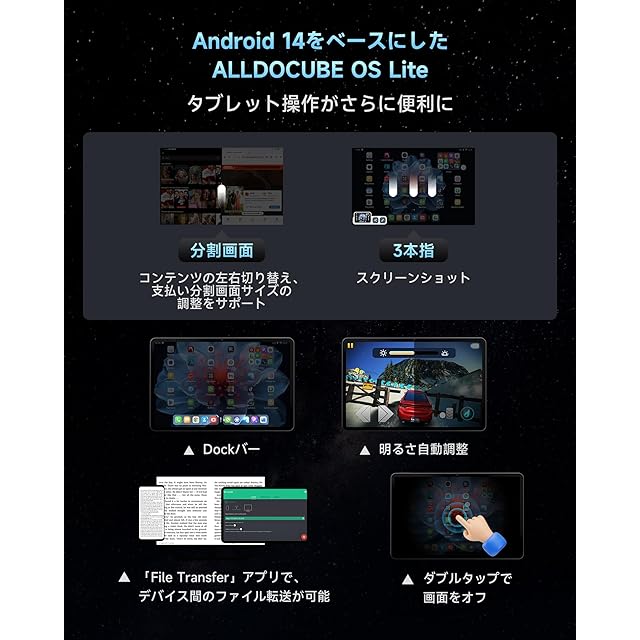 ✨【ALLDOCUBE OS Lite、初心者でも簡単に使用】✨ ①スマートAndroidタブレット機能:自動輝度調整、サイドバー、画面をダブルタップしてオフにする機能(「設定」アプリで有効化が必要)。②「ジェスチャー操作」機能で直感的かつ効率的な操作が可能:画面分割したいアプリを画面左上隅に移動すると、画面分割が起動します(左右または上下に画面分割を切り替えたり、サイズを調整できます)。画面分割を使用するには、設定 → システム → ジェスチャー → ナビゲーションモードからジェスチャーナビゲーションを有効にする必要があります。三本指でスクリーンショットを取得。③ 「FFT」アプリを使用すれば、ファイルをスムーズに閲覧したり、デバイス間でデータを転送したりできます。④ ホーム画面のアイコンは5x6または4x6形式で配置可能で、形状を丸型や四角型に設定できます。また、フォルダサイズの調整やアイコンの自動整列にも対応しています。⑤ Google検索バーは削除可能。 ※ALLDOCUBE OS LiteとALLDOCUBE OS 3.0にはいくつかの違いがありますので、ご注意ください。