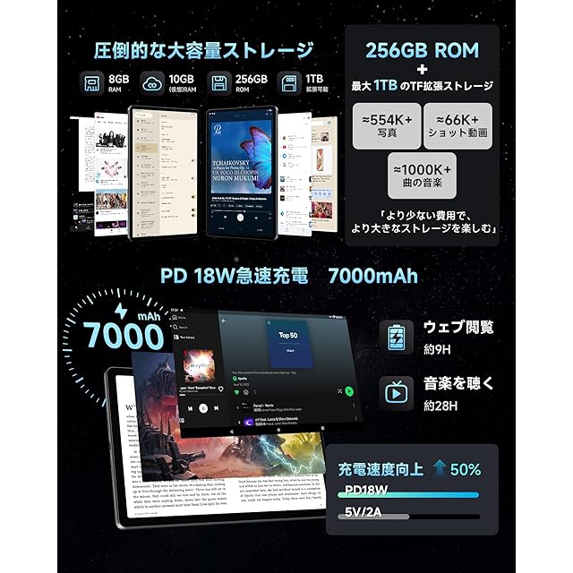 ⚡【7000mAh&PD18W急速充電】⚡11インチタブレットには7000mAhの大容量バッテリーを搭載し、一日中安心して使用できます。さらに、PD18W急速充電器が付属しているため,短時間で効率的に充電が完了。仕事や学習、エンタ 【4G LTE & 高精度ナビゲーションシステム】 4G LTE対応 で、いつでもどこでも高速インターネットが可能。デュアルバンドWiFi 5 & Bluetooth 5.2 で、安定したワイヤレス接続を実現。Google Lens をプリインストールし、簡単にスキャンや検索が可能。 重力センサー を搭載し、よりスマートな操作が可能に。さらに、GPS、BeiDou、Galileo、Glonass の4つのナビゲーションシステムに対応し、移動時の正確な位置情報を提供。旅行やドライブでも安心!ーテインメントなど、多様なシーンでストレスなく活用できます。サイズは253×164.6×7.6mmで,重量は471gです。どこにいてもスムーズな接続と快適な使用体験を提供します。