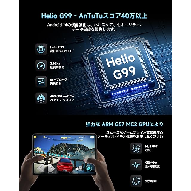 【Helio G99高性能プロセッサー & 18GB+256GBの大容量ストレージ】 MediaTek Helio G99オクタコアプロセッサー を搭載し、2.2GHz の高クロックA76コアでスムーズな動作を実現。T606と比較して、マルチタスク処理やゲーム性能がさらに向上しています。18GBの大容量メモリ(8GB物理+10GB拡張) でアプリの切り替えもサクサク!256GBのストレージ は最大1TBのTFカード に対応し、写真、動画、ゲームも思う存分保存できます。最新のAndroid 14搭載 で、ベンチマークスコアは 400,000以上を超える圧倒的なパフォーマンス!