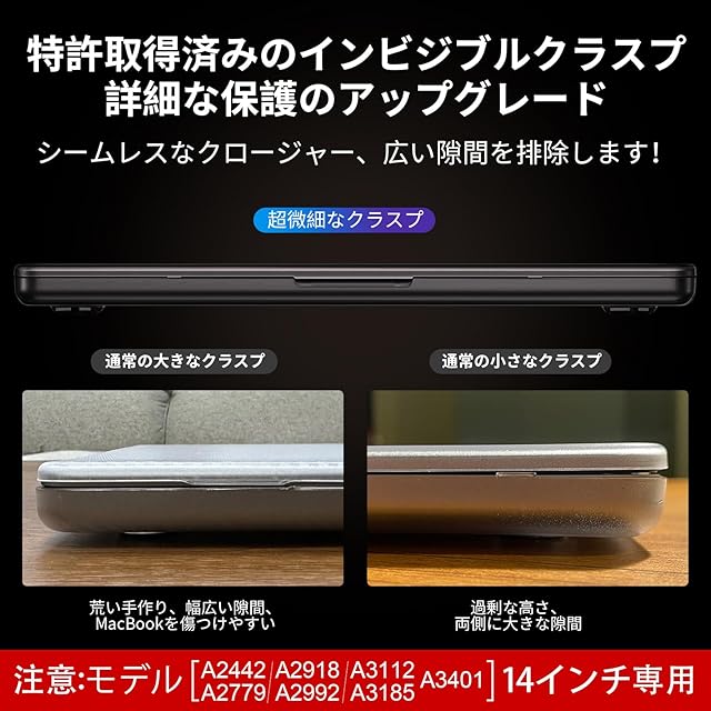 【10秒スナップオン、細部の保護】当社のミニバックルデザインにより、素早く簡単に取り付けることができます。 柔らかい保護コーティングにより、損傷することなく簡単に出し入れできます。 安いケースがノートパソコンを傷つけないようにしましょう。 *注意:MacBook Pro 14インチ 2023 2021のみに対応。 ご購入前に、ノートパソコン背面の型番(A2779、A2442)をご確認ください。