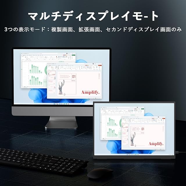 【多機能な表示モード】モニターは、複製モード、拡張モード、セカンドスクリーンモードをサポートしており、仕事の相談やプレゼン、ゲームや映画を楽しむなど、いつでも気軽に利用することができます。自宅でもモバイルワークでも、仕事の効率を上げることができます!