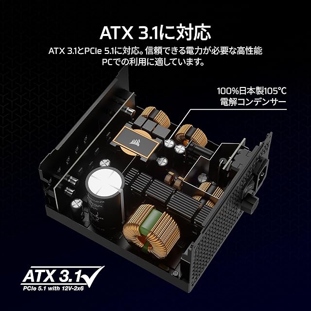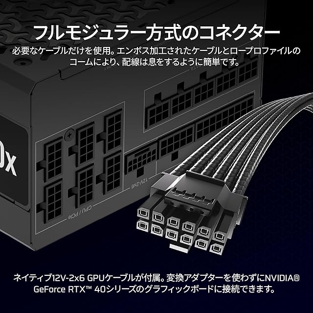 ATX3.1とPCIe5.1に対応し、安定した大容量の電力を供給できます。12VHPWRケーブルが付属しており、NVIDIA GeForce RTX 40シリーズなどにも対応可能です。