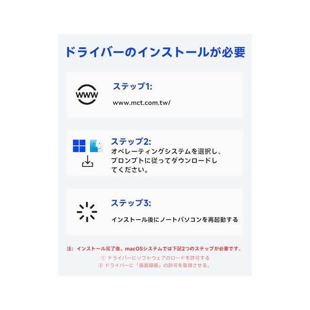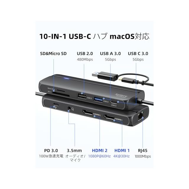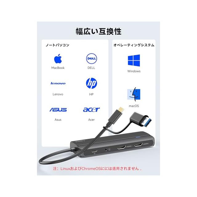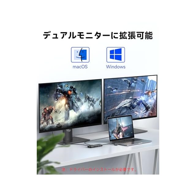 【10-IN-1 USB C ドッキングステーション ドライバーが必要】注意❤❤:このドッキングステーションは使用する前にドライバーをインストールする必要があります。「www.mct.com.tw/」からダウンロードしてください。❤USB Type-CポートにもUSB-Aポートにも接続でき、変換アダプター付きUSB C ドッキングステーションです。単一のUSB-C/USB-A接続で、ノートパソコン出力ポートを2つのHDMIポート、1つのUSB-A 3.0 ポート、1つのUSB-C 3.0 ポート、1つのUSB-A2.0ポート、1つの100W USB-C PDポート、1つのRJ45イーサネットポート、SD/TFカードスロット、イヤホンジャックに簡単に変換できます。家庭やオフィスのワークステーションに最適なソリューションです。*ご注意:HDMI(Alt.モード)は、ノートパソコンのType-Cポートがビデオ出力をサポートする必要があります。DisplayLink ドッキングステーション