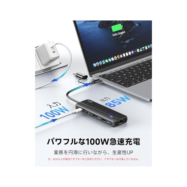 【PD急速充電対応typec ハブ】最大供給電力値100WのPDポート付き、usbハブを使用しながらパソコンに快速充電が可能で、充電切れの心配がありません。PD対応で最大85Wを実現します。※本type-c ハブの消費電力は最大15Wです。そのため100W出力のUSB PDアダプタ接続時はパソコンに対し85Wの給電となります。(理論値)また、このUSB C ハブは高品質なアルミニウム合金素材で作られ、放熱性がよく、耐久性にも抜群です