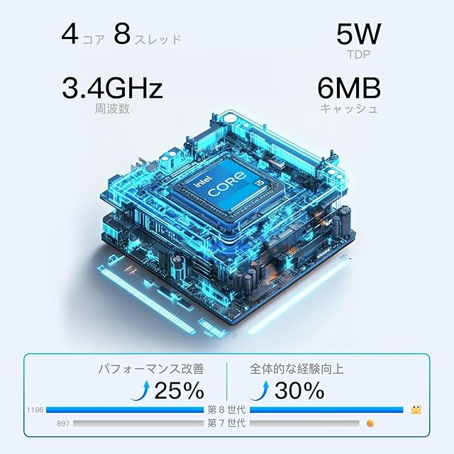 強力な性能: Intel Core i5-8250U プロセッサーを搭載し、4コア8スレッド、基本周波数は 1.6 GHz、最大ターボ周波数は 3.4 GHz に達します。前世代に比べて性能が 30%向上 しており、システムやアプリケーションの迅速な起動が可能で、マルチタスク処理でもスムーズな体験を提供します