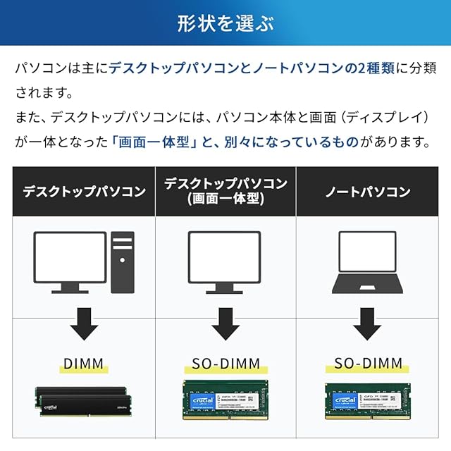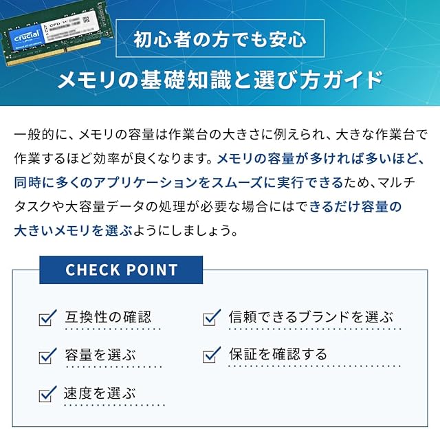 [Micronの品質:ワンランク上の信頼性]Crucialは、世界最大級のメモリメーカー、Micronのブランドの1つとして、信頼性の高いパフォーマンス構築のためのスタンダードとして評価されています。初代のSDRAMテクノロジーからDDR5に至るまで、Crucialのメモリテクノロジーは世界中のコンピューターの力となってきました。その歴史は40年以上に及び、これからも続きます。Crucialメモリは、長期によってサポートされ、システムに合わせて設計されています。安心してCrucialメモリをお選びください。