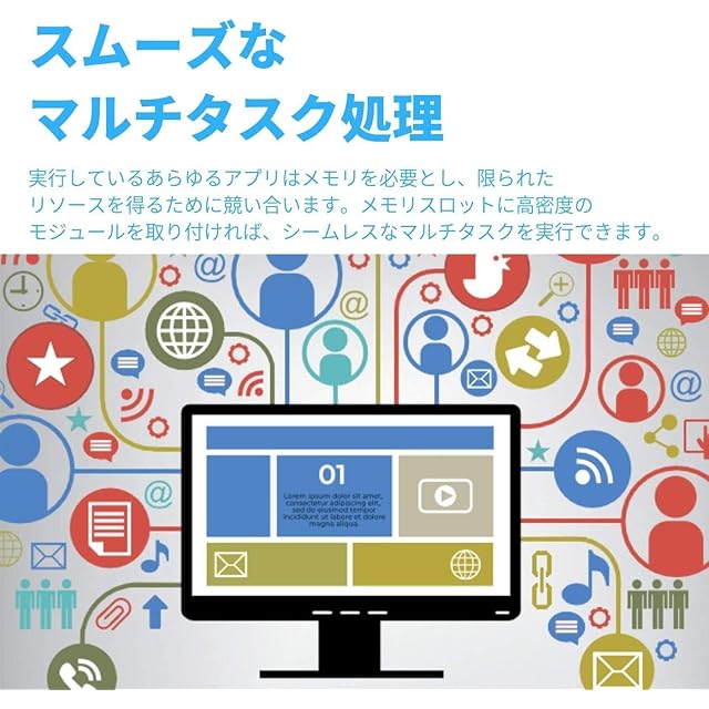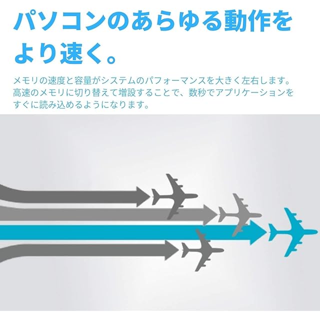 [コンピューターのパフォーマンスをすばやく簡単に向上させる方法]メモリを増やして速度の遅いコンピューターを簡単にもっと速く。システムを高速化しスムーズに動作させるために設計されたCrucialのメモリは、手頃な価額で最も簡単にシステムパフォーマンスを向上できる手段の1つです。プログラムの読込が高速化されます。応答性が向上します。アプリケーションが簡単に実行できるようになり、マルチタスク性能が向上します。