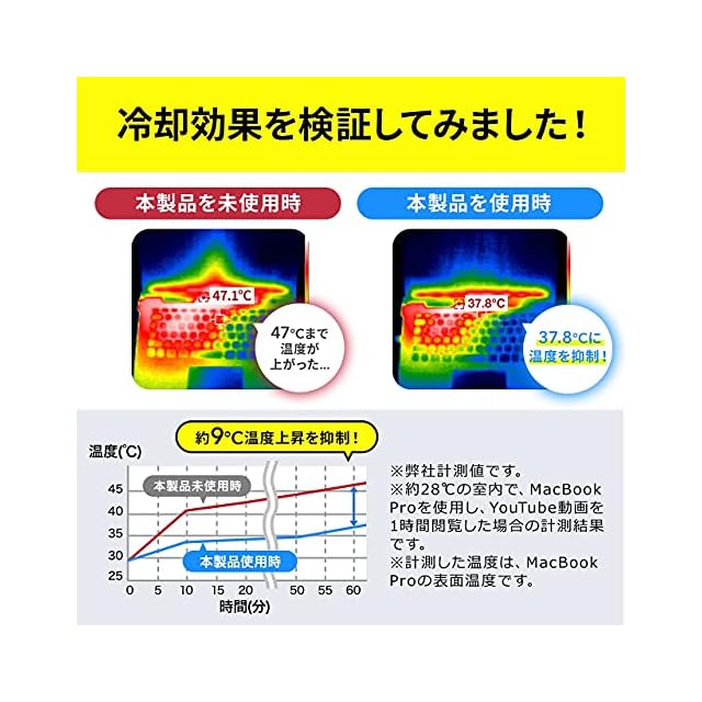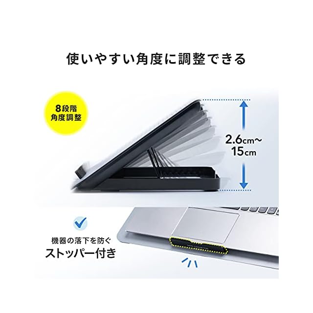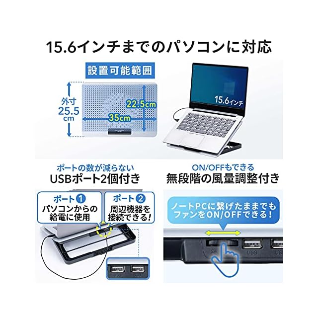 冷却面のサイズは幅35×奥行22.5cmです。最大15.6インチ程度までの様々なサイズのノートパソコンやタブレット等にも使用できます。