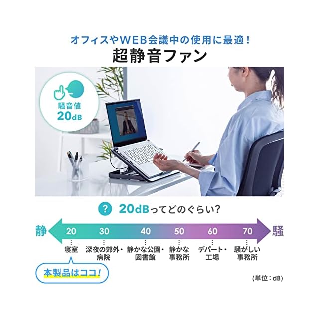 1ポートは本製品への電源供給用で、ノートパソコンから給電できます。もう1ポートにはUSBメモリやマウスなどを接続して使用できます。ファン稼働時でも騒音値は20dBで、パソコン作業の邪魔になりにくいです。