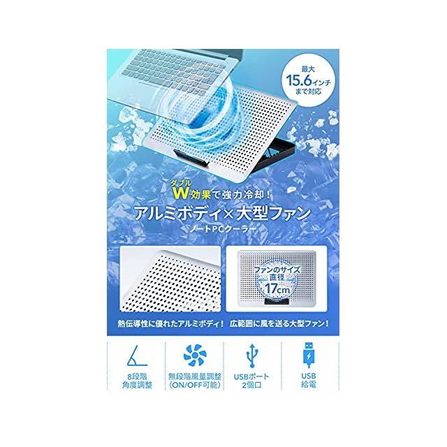 1つの大型ファンでノートパソコンの熱暴走を防ぐ、ノートパソコンクーラーです。熱伝導性に優れたアルミボディを採用しています。