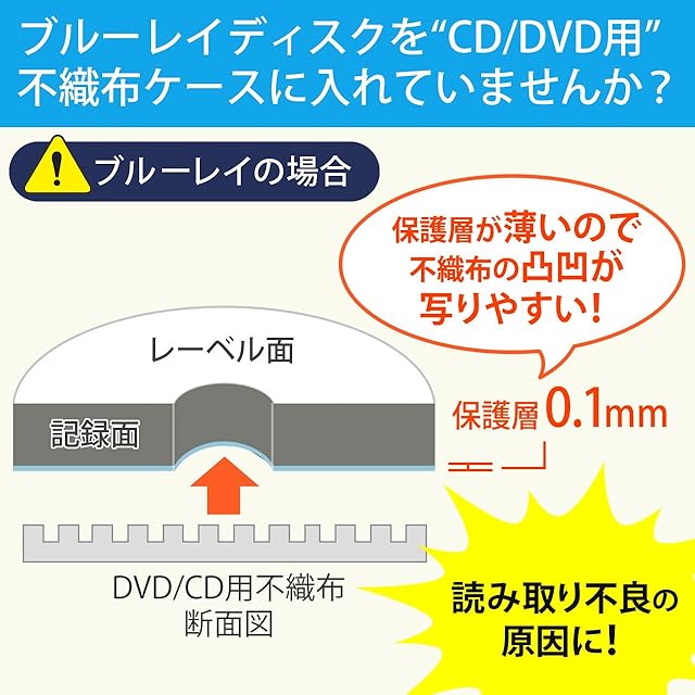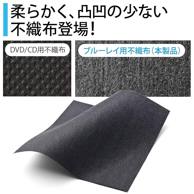 ブルーレイディスクの記録面に跡を残しにくい、凸凹が少なく柔らかい不織布を使用しています。ディスクを出し入れする際の摩擦によるキズを防止します。
