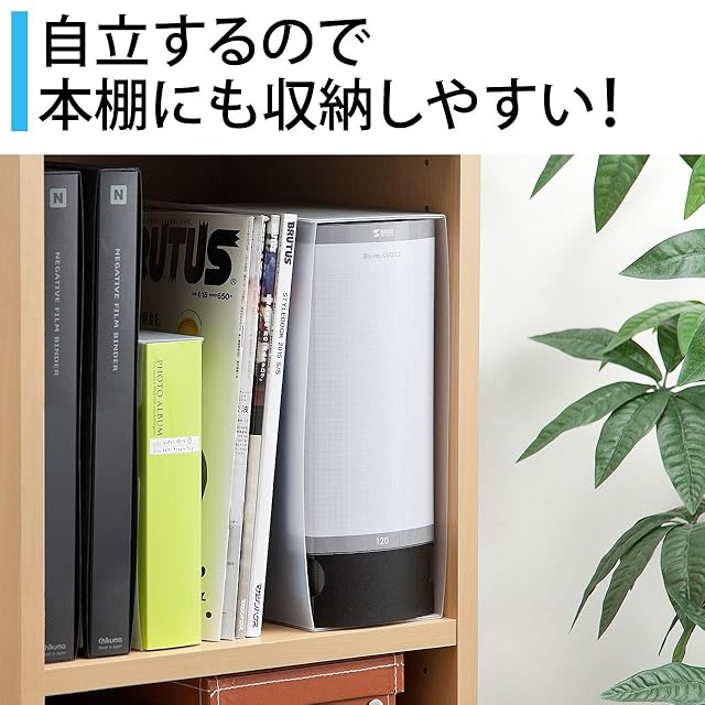 自立するスクエア型なので、本棚等への収納もしやすくなっています。透明ケースから取り出しやすいようフィンガーホールが付いています。高さ149mmでTVラックへの収納にも最適です。