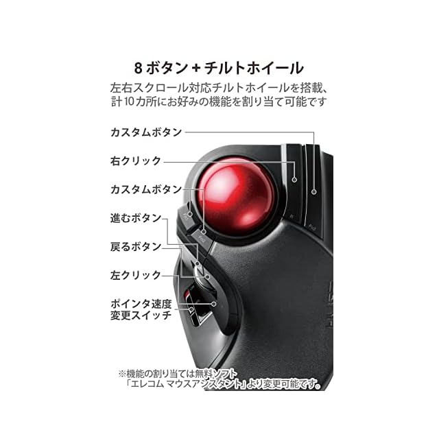 直径52mmの大型ボールを採用したことで、一度の操作でポインタをより広範囲に動かせる人差し指・中指操作タイプのワイヤレストラックボールマウス“HUGE"です。