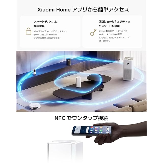 ✅パスワード入力不要のNFCワンタッチ接続:Xiaomi製のスマートデバイスはWi-Fiパスワードを自動的に同期し、変更しても再ペアリングは不要です。さらに、NFC機能内蔵のため、スマートフォンでルーターに触れるだけでWi-Fiに接続が可能でパスワードを入力する必要はありません。