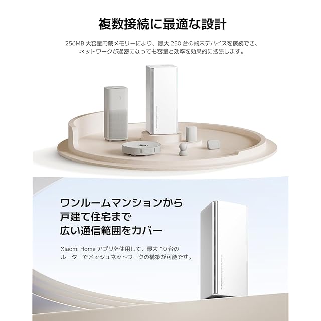 ✅ワンルームマンションから戸建て住宅まで広い通信範囲をカバー:使用範囲によって単品から複数台まで選んでいただけます。Xiaomi Homeアプリを使用して、最大10台のルーターでメッシュネットワークの構築が可能です。256MB大容量内蔵メモリーにより、最大250台の端末デバイスを接続でき、ネットワークが過密になっても容量と効率を効果的に拡張します。