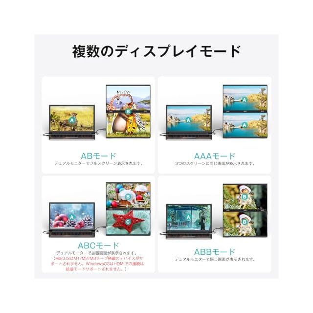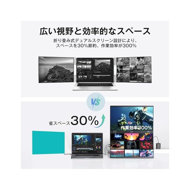 【18.5インチで作業効率UP】ドライバー不要で、すぐに使える18.5インチのデュアルモバイルモニター。従来の15.6インチモデルよりも10%以上画面表示範囲が広がり、作業効率が大幅に向上します。プラグアンドプレイ対応で、USB Type-Cポート×3、HDMIポート×1を搭載し、最大3つの画面を同時に表示可能です。USB Type-CポートはDisplayPort Altモードに対応しており、複数のデバイスを効率よく接続できます。また、画面のちらつきや再起動を防ぐため、安定したパフォーマンスを維持するために外部電源接続が推奨されます。