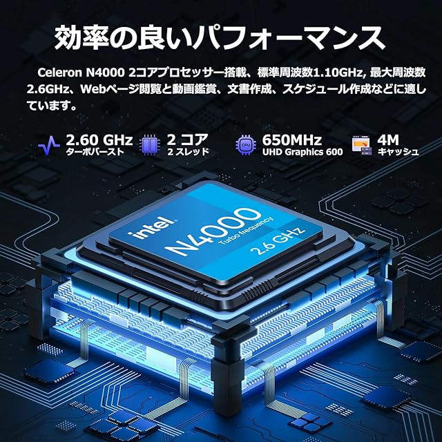 主なスペック:TPV ノートパソコン インテル Celeron プロセッサー N4000(1.1GHz~2.6GHz)搭載, LPDDR4 メモリー8GB(オンボード), 大容量M.2 SATA SSD 256GB搭載(1TBまで換装可能), インテル UHD グラフィックス 600, 最新版OS Windows11 Pro, 64ビット, Office 2024 LTSC搭載