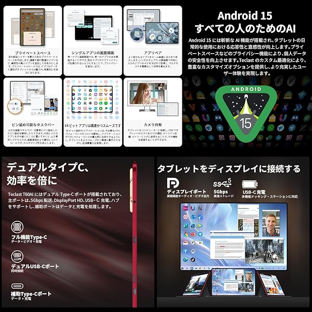 【Android 15 タブレット12インチ初登場】TECLAST T60Ai 12インチタブレットは最新Android15 OSを搭載し、64ビットAPPアプリケーションに深く最適化され、起動と応答速度が向上しています。 また、弊社の二次開発では、システムUIの一部が改善・最適化され、より多くのサードパーティ製アプリケーションに適応し、システムインタラクションがよりフレンドリーで便利になりました。プライベートスペース:機密性の高いアプリやデータを見えないようにします。アプリのペア:最もよく使用するアプリをペアリングすることで、タップでマルチタスクを実行します。固定可能なタスクバー:お気に入りのアプリを手の届くところに置いておきます。カメラの共有:USB有線接続により、カメラのないパソコンでもタブレットカメラを簡単に共有でき、タブレット12インチの機能を拡張できます。また、単一アプリの画面録画、16Kメモリーページング・サポートなど、他のアンドロイド15の新機能も搭載している。アンドロイド15タブレットT60AIは、自信を持って探索し、道を発見するのに役立つ新機能を提供しています。 【AIシリーズ初のタブレット,TECLAST T60 AI アンドロイド15 タブレット12インチ登場、Widevine L1 対応】Teclast独自のAI技術を搭載したT60 AIタブレットは、AIシリーズ初のタブレットで、インテリジェントな機能と高度なパフォーマンスを提供します。従来はCPUの消費電力が大きい演算処理も、独立したNPUを搭載することで低消費電力で実現できる場合がありました。 そこで弊社では、NPUを深く活用し、高効率なAi演算を行うインテリジェントなAPPを開発することで、タブレットの使用感を向上させ、より斬新な遊び方を提案します。Ai 革新的で知的な新しい体験:① Ai-SRビデオ最適化;②Ai姿勢認識;③Aiエアージェスチャー;④PCモード;⑤Ai文字認識抽出など。このAndroid15タブレットは新機能が多いので、問題があればいつでも弊社に連絡して解決してください。T60AI アンドロイド15タブレット12インチは、Widevine L1をサポートしており、世界中の30以上の主要なビデオアプリでの高品質なビデオ再生を楽しむことができます。