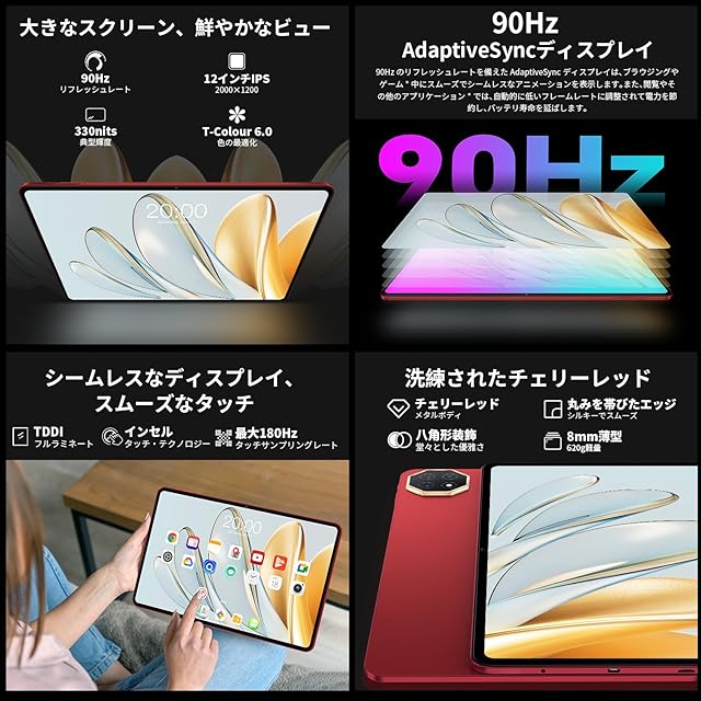 【12インチタブレット wi-fiモデル(WiFi6+BT5.4)・Incell IPS 2K画面・T-Colour6.0色最適化・5MP/13MPカメラ】より高速で低遅延のWiFi6ワイヤレスネットワーク接続をサポートし、より快適な接続体験を提供します。 低消費電力のBT5.4は、LDAC HDコーディングフォーマットをサポートし、より良いワイヤレスオーディオを楽しむことができます。新たにアップグレードされたT-Colour6.0色最適化技術は、AI計算によってあらゆる面で表示効果をさらに高めることができる120Hz/180Hzの高いタッチサンプリングレートを持つincellタッチ技術は、TDDI統合フルラミネーションプロセスとともに、タッチ感度を向上させ、携帯電話のような絹のように滑らかなタッチを実現する。背面13MPオートフォーカスレンズは、AIセカンダリーカメラとともに、素晴らしい瞬間を記録するために、より速いフォーカシングと撮影を可能にします。 フィルライトを使えば、暗い場所での撮影効果もより鮮明になります。よりスムーズでクリアなビデオ通話を可能にするフロント5MPカメラ。