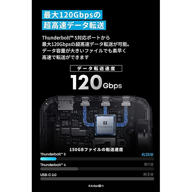 最大120Gbpsの超高速データ転送:Thunderbolt 5対応ポートから最大120Gbpsの超高速データ転送が可能。データ容量が大きいファイルでも素早く高速で転送ができます。