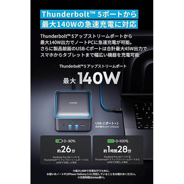 Thunderbolt 5ポートから最大140Wの急速充電に対応:Thunderbolt 5アップストリームポートから最大140W出力でノートPCに急速充電が可能。さらに製品前面のUSB-Cポートは合計最大45W出力でスマホからタブレットまで幅広い機器を充電可能。