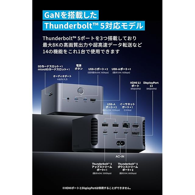 GaNを搭載したThunderbolt 5対応モデル:Thunderbolt 5ポートを3つ搭載しており最大8Kの高画質出力や超高速データ転送など14の機能をこれ1台で使用できます。