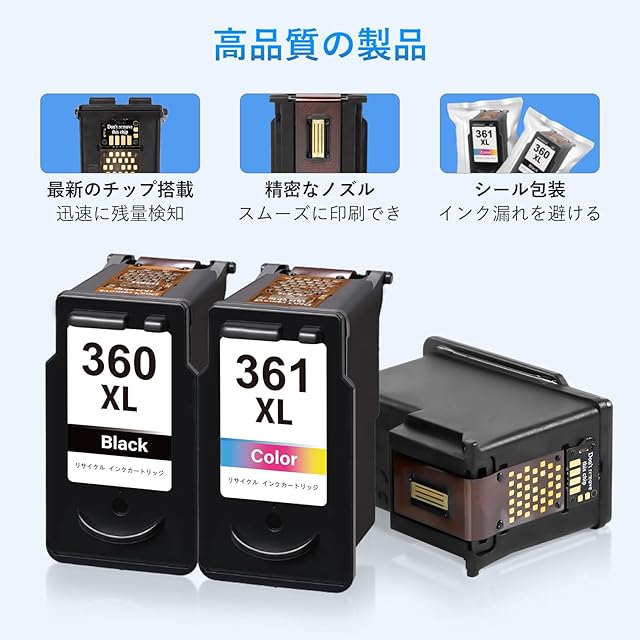 【増量枚数】弊社の 360 361 インクカートリッジ は 純正 より大容量で、印刷枚数アップ(A4用紙・5%のカバレッジ) BC-360XL 黒 は約750枚 BC-361XL カラー は約600枚印刷可能です。コスト削減になります。
