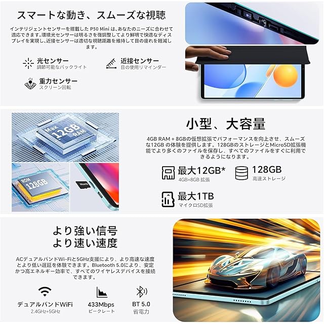【12GB+128GB+1TB拡張+高性能8コアCPU+G57 GPU】このアンドロイド15 タプレットは 12GBメモリ(4+8仮想)RAMは、ゲームやビデオ、電子書籍などあらゆるアプリの快適な動作をサポートします。128GBの内蔵ROMストレージは、日常のニーズに応える。SDカードスロットで1TBまで簡単に拡張でき、電子書籍やビデオ、ゲームのダウンロードに余裕があります。◆TECLAST P50MINI はUnisoc T7200オクタコアチップを採用しており、スマートオフィス、効率的な学習、映像エンターテインメントなど、あらゆるシーンに対応できます。2つの大型コア[email protected]と6つのA55のスマートAIチップを搭載し、高速な演算速度を実現しています。アンドロイド15 タブレット 8インチに搭載されたMali-G57 GPUは、インテリジェントなアルゴリズムにより、ディスプレイの色やディテールを強化し、ゲームや詳細な動画再生において、より一層美しいビジュアルを実現します。