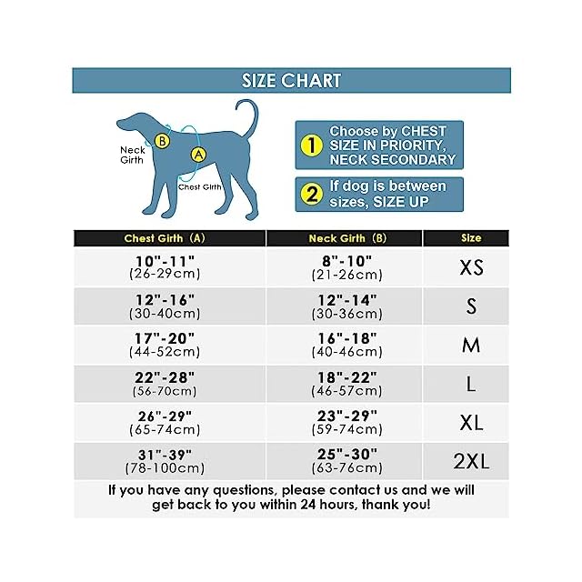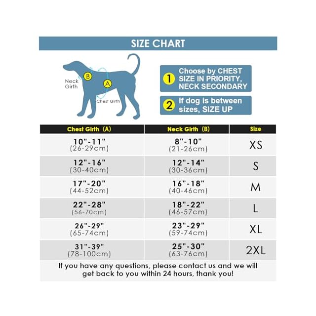 【サイズ】S:首周り:43-50cm、バスト:46-55cm、背丈:22cm。M:首周り:49-59cm、バスト:52-63cm、背丈:25cm。L:首周り:59-70cm、バスト:59-72cm、背丈:30cm、XL:首周り:66-79cm、バスト:74-87cm、背丈:36cm。 XXL:首周り:76-93cm、バスト:96-116cm、背丈:42cm。