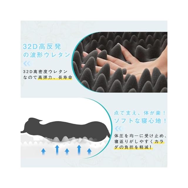 【高反発で寝返りし放題】ベッドクッションはプロファイル加工された高反発ウレタン素材を採用し、 凹凸の点で体を支えて、体圧分散が均等に行われ、 体への負担が軽滅され、快適な寝心地を実現しました。 高反発犬ベッドなので、床ずれ予防にもつながります。 寝返りし放題で、高齢ペットや子犬にオススメです。