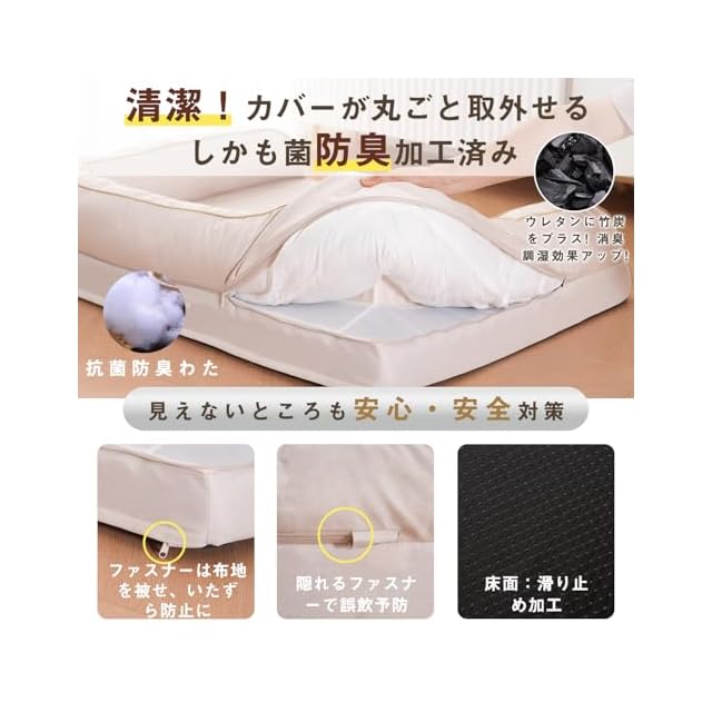 「毛がつきにくい、お掃除が簡単」:高品質オックス生地は、犬猫の毛がつきにくく、毛玉もできにくい。汚れはサッと拭くだけ!「カバー丸洗い可能」:全周ファスナー付きで、カバーだけを簡単に取り外し可能。(※中綿ウレタンは洗濯NG)「滑り止め・防水底面」:底面には滑り止め加工を施し、足腰の弱った愛犬の転倒防止をサポート。底面も防水加工され、床を汚す心配もありません。「国際安全基準認証」:使用素材は、有害化学物質検査をクリアした最高レベルの安全基準「OEKO-TEX STANDARD 100」を取得。 ペットにも家族にも、安心してお使いいただけます。