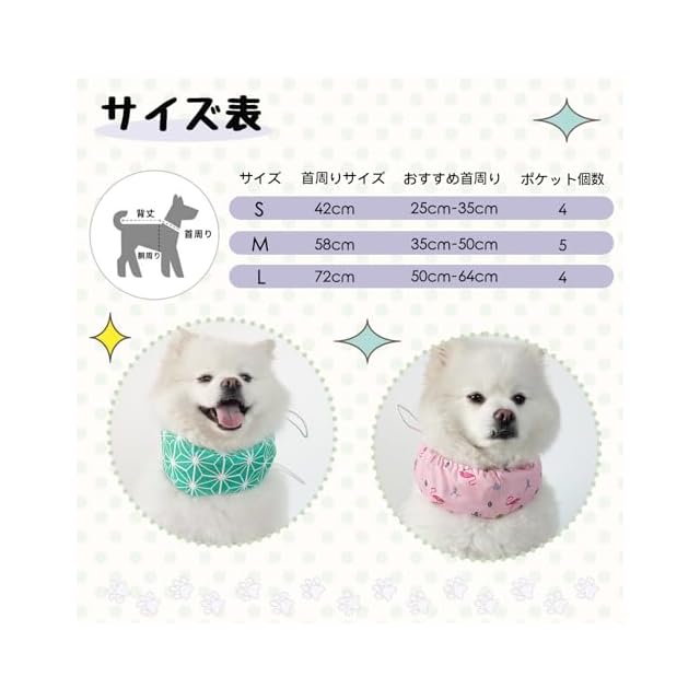 【サイズ】★クールネック★Sサイズおススメ首周り25-35㎝(保冷剤四つ付)、Mサイズおススメ首周り35-50㎝(保冷剤五つ付)、Lサイズおススメ首周り50-64㎝(保冷剤六つ付)。★クールベスト★Sサイズおススメ胴周り40-50㎝(保冷剤六つ付)、Mサイズおススメ胴周り50-60㎝(保冷剤八つ付)、Lサイズおススメ胴周り60-70㎝(保冷剤九つ付)。※ストッパーやマジックテープでサイズを調節することができます。