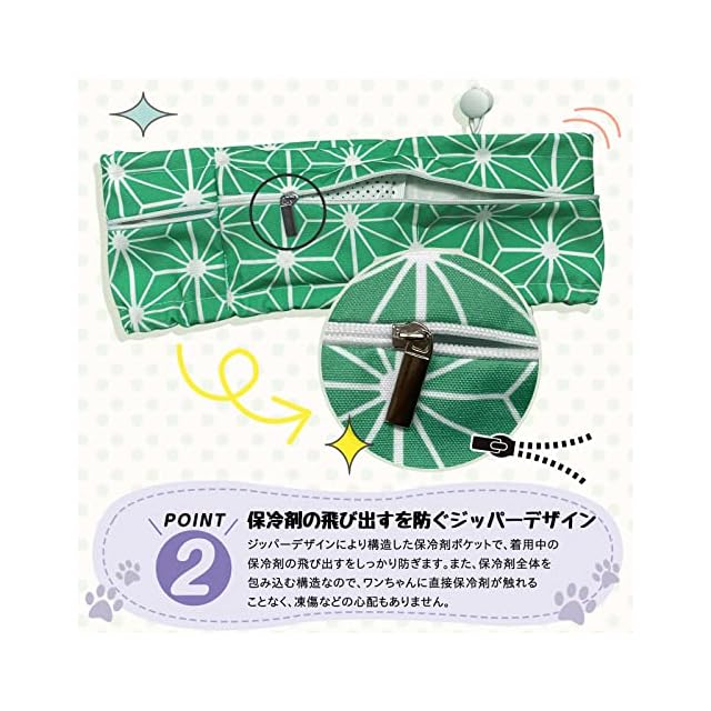 【保冷剤の飛び出す防止デザイン】保冷剤の飛び出すをしっかり防止するために、クールネックが入るところにジッパーを付き、クールベストの保冷剤ポケットが二重構造をした。また、どちらも保冷剤全体を包み込むデザインなので、ワンちゃんに直接保冷剤が触れることなく、凍傷などの心配もありません。