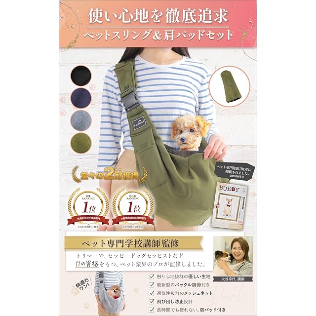 【肩パッド付き ペットスリング 】 ペット専門学校講師監修のもと完成した、最大10kgまで対応可能な肩パッド付きの少し大きめのペットスリングです。デザインと機能性に徹底的にこだわっており 付属の肩パッドは、長時間の持ち運びによる肩の負担の軽減や長さ調節用のバックルが当たって痛い場合などの問題を解決します。 ペットとの快適なお出かけをお楽しみください。