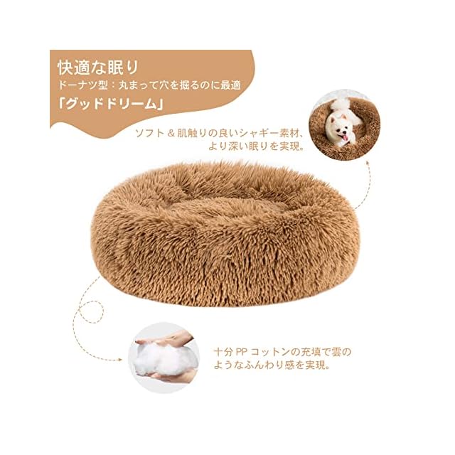 【フワフワ】この猫ベッドの表面は4CMのシャギー製長毛素材となり、ぽかぽかで肌ざわりよくてあったかいです。快適で柔らかい、滑らかな手触りのペットベッドです。丸型はある程度で体を包み込むような暖かさを提供しており、ペットちゃんに暖かい環境を与えます。底部と側面に綿が程よく詰まっているので気持ちよくリラックスして休めます。