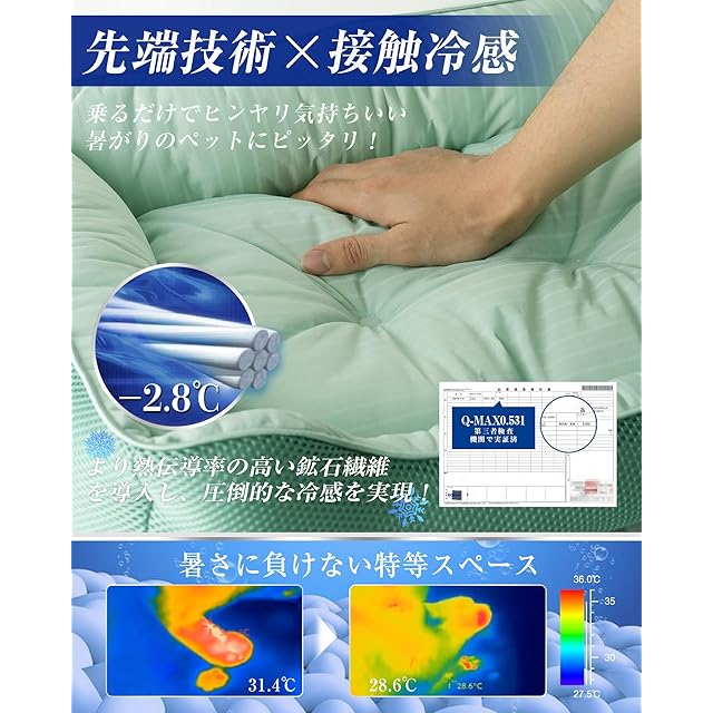 【超クール・ペットベッド心地良いヒンヤリ感のヒミツ!】業界冷感最高レベルの接触冷感生地(Q-MAX値0.531 ※接触冷感(q-max:W/㎠)基準値の約2.7倍!)の採用で、犬猫の熱中症対策に!「IMA HOME ひんやりペットベッド」は先端技術瞬涼糸を使用して、究極冷感繊維一本一本にこだわり、より熱伝導性の高い鉱石繊維を導入し、圧倒的な冷感を実現!ヒンヤリ感がずっと続く接触冷感生地なので、心地良い冷涼感が一日中持続します。洗濯してもヒンヤリ感は持続します。冷房をつけない寝苦しい夜にも寝るたびに幸福度が増す!
