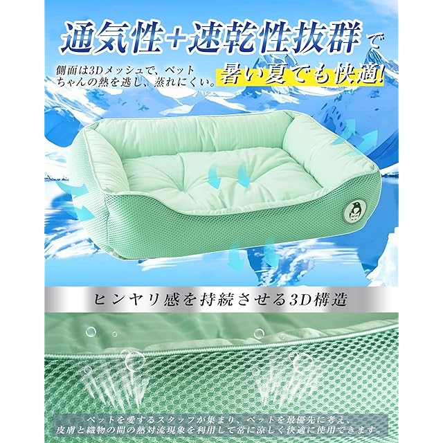 【「3Dメッシュ」でムレずに快適】通気性に優れた3Dメッシュ素材は素早くペットちゃんの熱を外に排出し、皮膚と織物の間の熱対流現象を利用して、サラッとムレにくく爽やかに眠れます。「接触冷感×3Dメッシュ×日本企画」超クール・ペットベッドは通気性、速乾性抜群で、一晩中さらりとしたひんや〜り気持ちの良い肌触りを体感いただけます。
