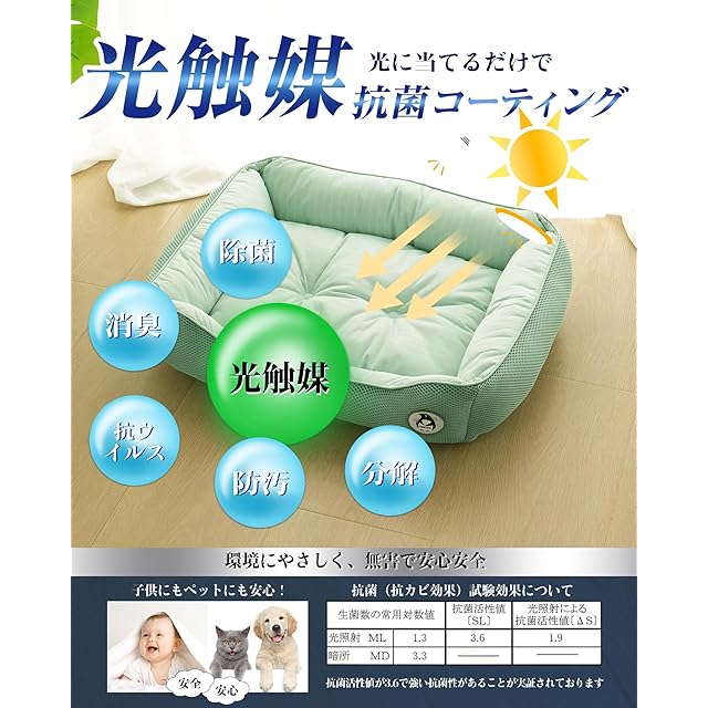 【【除菌】 【抗菌】 【消臭】を解決!】愛犬家・愛猫家の皆様に支持され、愛犬と愛猫の睡眠と健康を守るための機能をギュッと詰め込んだ究極のひんやりペットベッドです。人のように毎日お風呂に入ることができないペットたちなので、清潔を保つために、「IMA HOME ひんやりペットベッド」は光触媒の力によって、太陽の光が当たることで、有害物質を無害化、分解し、増殖を抑えることができます。さらに、中綿も抗菌防臭加工で、湿気やペットから出るニオイや細菌の心配もありません。暑い夏でも愛犬・愛猫の睡眠と健康を守るために、ぜひお試しください。